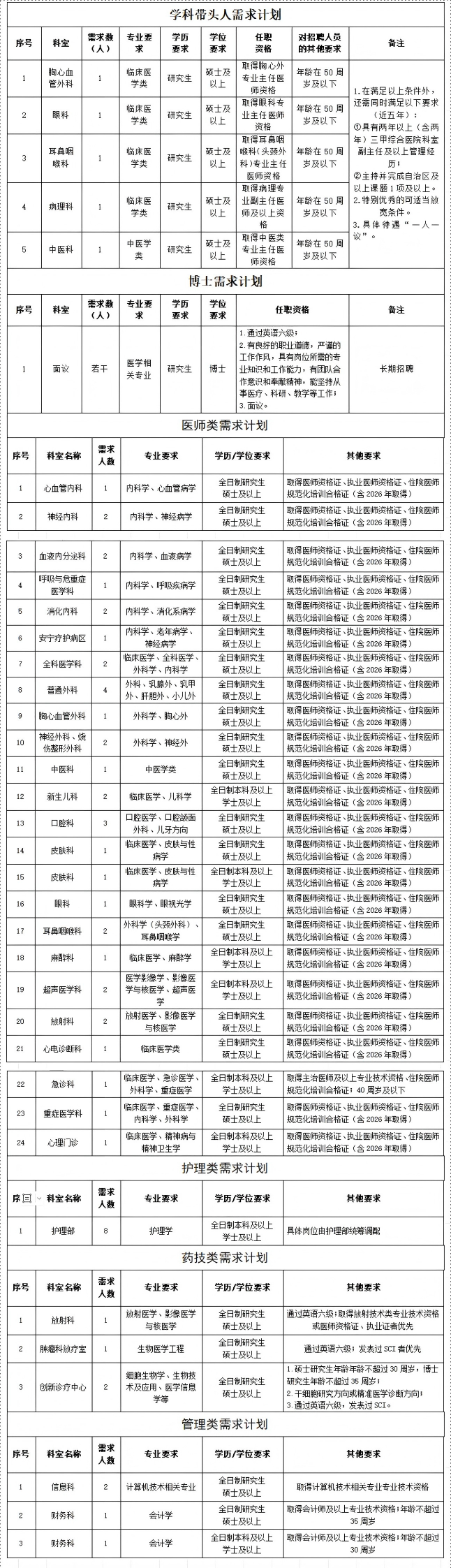 為進一步完善現(xiàn)有人才隊伍,促進醫(yī)院學(xué)科發(fā)展,提升醫(yī)院綜合實力,因業(yè)務(wù)發(fā)展需要,現(xiàn)面向社會進行公開招聘,具體招聘崗位如下: