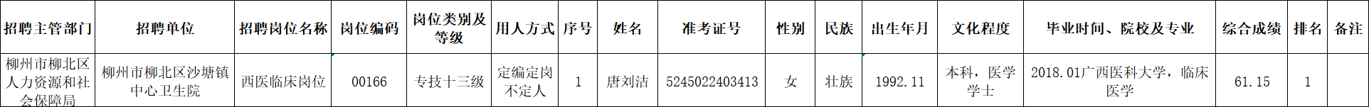根據(jù)《柳州市2025年度下半年事業(yè)單位公開考試招聘工作人員公告》要求及安排,唐劉潔同志經(jīng)面試、考察、體檢合格,符合聘用條件。經(jīng)研究決定,擬聘用唐劉潔同志為我區(qū)事業(yè)單位工作人員,現(xiàn)予以公示,公示期為5個(gè)工作日(2026年1月22日至2026年1月28日)。對(duì)擬聘用的同志如有異議,請(qǐng)以書面形式,并署真實(shí)姓名和聯(lián)系地址,于2026年1月28日前郵寄或直接送我單位(地址:柳州市柳北區(qū)鷓鴣江六隊(duì)南200米(北外環(huán)路南)柳北區(qū)衛(wèi)生健康局512室;郵編:545002,電話0772-2802642),群眾如實(shí)反映有關(guān)問(wèn)題受法律保護(hù)。